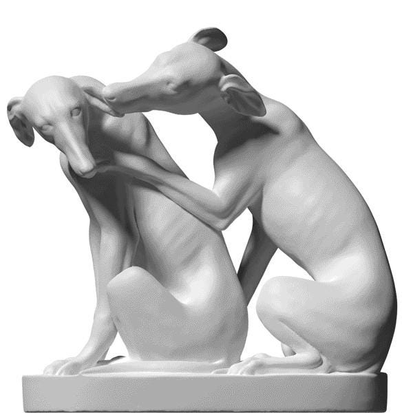 🐕 Two Greyhounds: A reproduction of "Gruppe mit zwei Windhunden" (Group with Two Greyhounds), a celebrated work of 19th-century animal sculpture.
